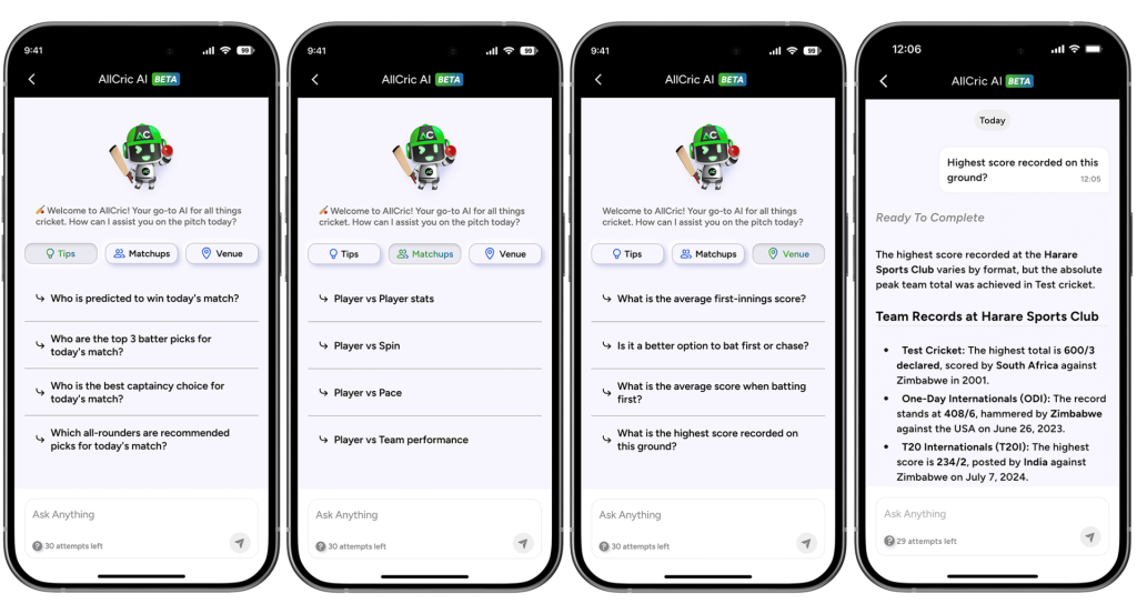 Cricket matches are dynamic, and user questions change as the game progresses. Ask AI ensures users are never stuck guessing or overwhelmed by information. It acts as a smart, always-available companion that evolves with the match, helping users make sense of situations as they happen.